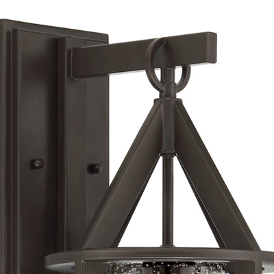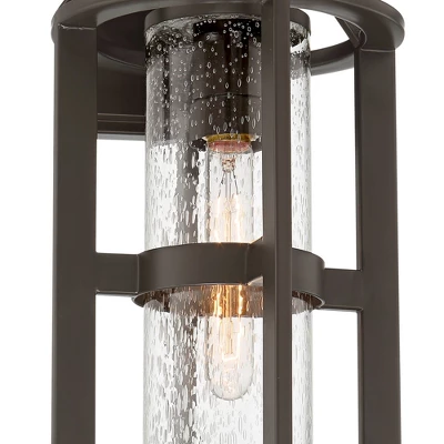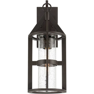 A modern design with a comforting rustic touch, this lantern-style outdoor wall light will bring high style to your porch or walkway. Attached to a rectangular backplate, the bronze finish metal frame houses a clear glass cylinder shade with a seeded rain-flecked look. This fixture is guaranteed to bring warmth and illumination to any outdoor space.