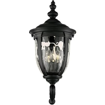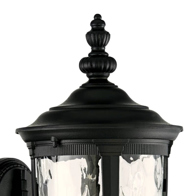Inspired by traditional European lighting designs, this outdoor wall light is a beautiful choice for your porch or patio space. It comes in a texturized black finish over a sturdy die-cast metal construction and features clear hammered glass for an elegant, refined look. A scrolling upbridge arm adds a great decorative touch. From the Bellagio collection by John Timberland.