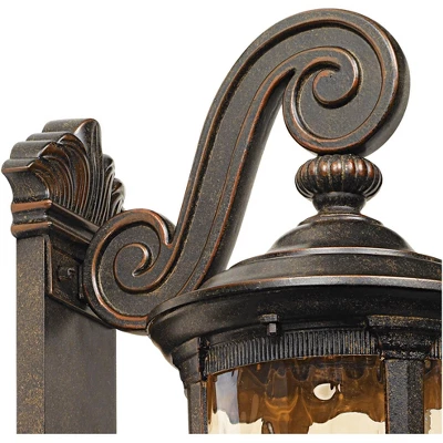 The Bellagio collection by John Timberland is inspired by classic European designs and guarantees a lovely traditional look. This outdoor wall light comes in a warm bronze finish over sturdy die-cast metal construction and champagne hammered glass for antique vintage styling. Dual upbridge and downbridge scroll arms complete the elaborate look of this fixture.