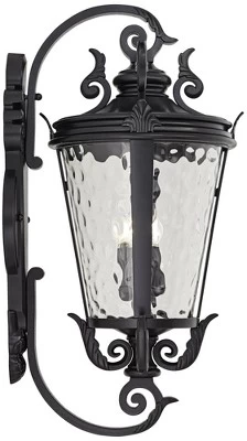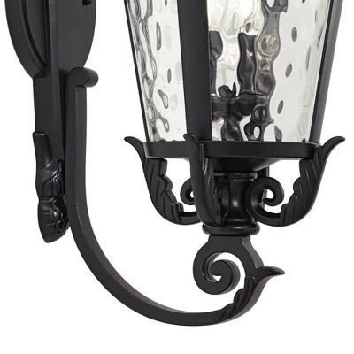 This large outdoor wall light design features lavish Mediterranean styling from John Timberland®, The design was inspired by the romance and magic of the port city of Marseille, and the large size makes it ideal for grand entryways, porch areas, or anywhere you need extra illumination and curb appeal. Details include clear hammered glass paired with rich detailing, and a textured black finish.