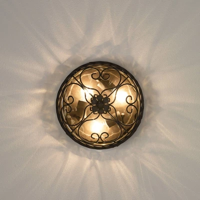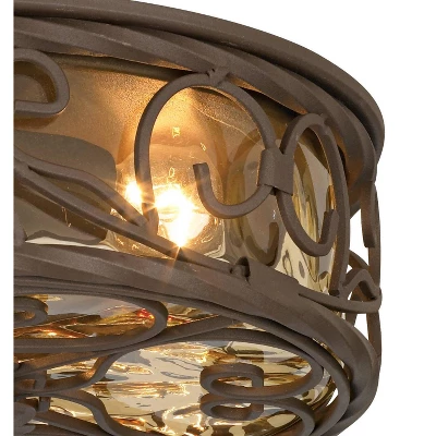 Add a touch of classic Spanish style to your home with this fixture. From the Casa Seville collection, this charming indoor-outdoor ceiling light serves as a warm accent piece. It comes in a tight flushmount design with champagne water glass, covered with a dark walnut frame with decorative scrolls and metal twist details.