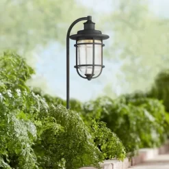 Complement a patio or path with the nautical feel of this LED landscape path light by John Timberland®. Embrace a classic lantern-inspired design with roots in dockside decor of a bygone era. Clear seedy glass is caged with metal while a textured black finish offers ample contrast and depth. Energy-efficient with a built-in 4 watt LED module offering 350 lumen output and a 3000K color temperature.