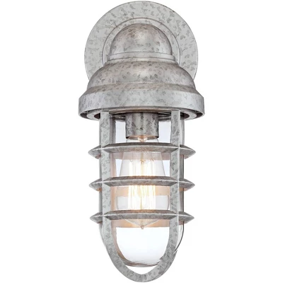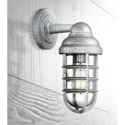 - Wall light from the Marlowe collection by John Timberland. Sturdy die-cast steel construction made to look galvanized. Cage frame. Clear glass.