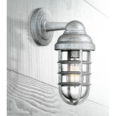 The Marlowe collection of outdoor lighting offers a creative combination of nautical style and industrial design. This set of two metal outdoor wall lights features a stylish cage design with a narrow glass shade inside. The steel construction is made to look galvanized for an urban-rustic look. Perfect for a patio space or garage area, these versatile fixtures can be installed pointing up or down.