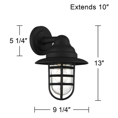 The Marlowe collection of outdoor lighting offers a creative combination of nautical style and industrial design. This metal outdoor wall light features a stylish cage design with a hood on top and a narrow clear glass shade inside. A matte black finish completes the hardy, rustic look. Perfect for lighting up a patio area or garage space.
