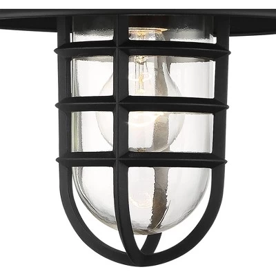 - Black metal finish cage frame with hood. Sturdy die-cast metal construction. Clear glass shade inside the cage.