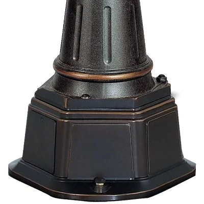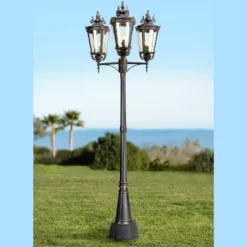 The allure and romance of the Mediterranean landscape beckons with this handsome outdoor lantern. From the John Timberland® lighting collection, it features three large lantern style fixtures with antique-look hammered glass. A Veranda bronze finish and ornate scrolls accent the design. Comes complete with top lights, pole, and surface mount adapter base. Lights and pole have a sturdy die-cast construction. Installation to concrete slab only.