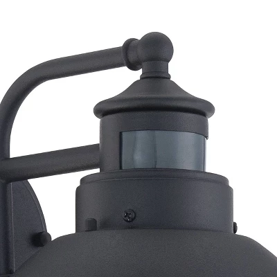 Inspired by classic Mission styles, this outdoor wall light fixture will add a traditional barn light look to your porch or patio. It comes in a handsome black finish over a steel frame, and has a round clear seeded glass shade that protects the bulb. Best of all, this design is outfitted with both a motion sensor and a dusk-to-dawn photocell sensor, giving you an extra sense of security. Dual-bright design means the light turns on at 25% brightness and goes to 100% when motion is detected. Two minutes after motion is no longer detected, the light will revert to low-level brightness.