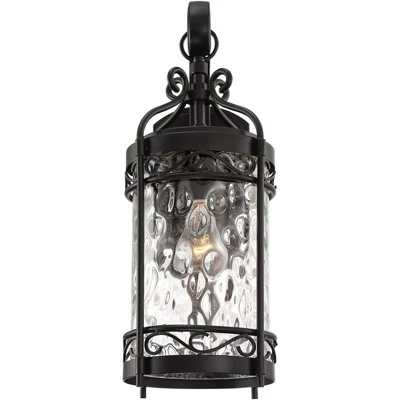 Create a look inspired by classic European tastes with this traditional wall light. From the John Timberland brand of outdoor lighting, the lantern profile of the design hangs down from a decorative scroll arm. A matte black finish adds charm and class to blend in with many existing decor styles. Hammered glass uplifts the look to add texture and stunning diffusion of the light within.