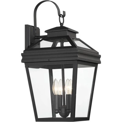 Brighten up a dark patio or garage space with this four-light outdoor wall light. It comes in a textured black finish over a steel frame, with clear glass panels that give a full view of the bulbs inside. Modeled after traditional lantern styles, this outdoor lighting fixture is sure to add elegance to your home.