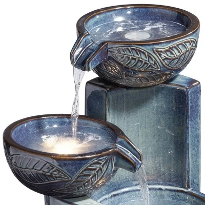 Add an exotic look to a casual space with this three-tier cascading floor fountain by John Timberland®. Energy-efficient LED lighting creates mood-enhancing effects to a ceramic fountain with a gradient midnight blue finish. Charming spouted bowls with ornate leaf accents produce a circular flow of water to engender a calming feel in any space.