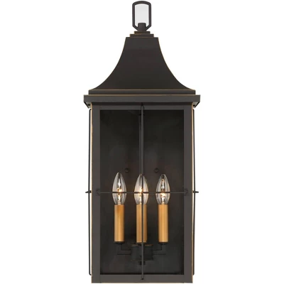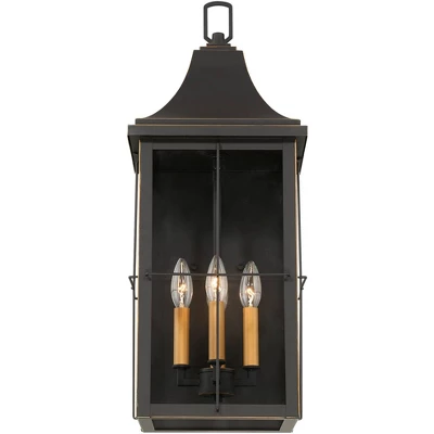 The Sunderland four-light outdoor wall light from John Timberland offers a handsome traditional look for your home. The rectangular steel frame is covered in a classic finish with subtle gold finish accenting and candles for an elegant expression. Clear glass panels give a full look of the light bulbs used within, making decorative bulbs a great choice for this fixture.