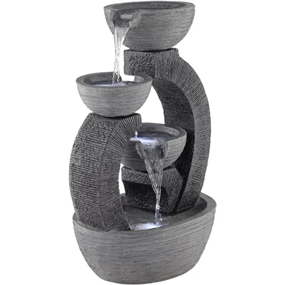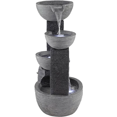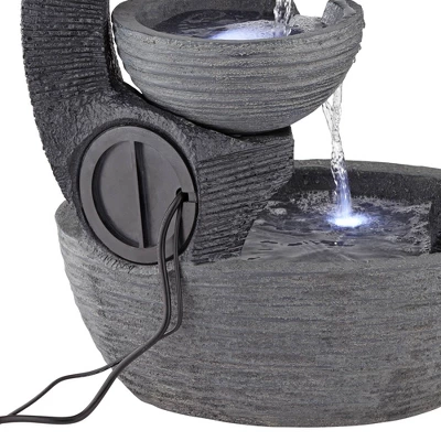 Designed with a blend of art and architecture, this LED lighted floor water fountain brings a commanding accent to any space. With energy-efficient LED lighting, this fountain by John Timberland® goes above and beyond with mood-enhancing illumination for after-dark use. A blend of gray finishes accentuates the exotic silhouette of pots, bowls, and curved supports.