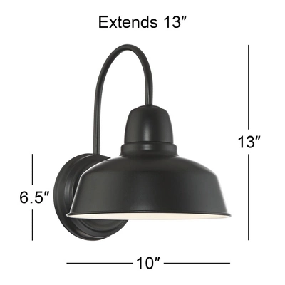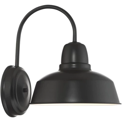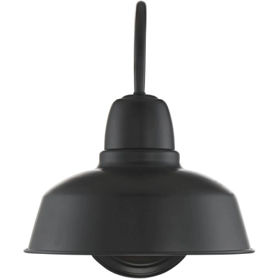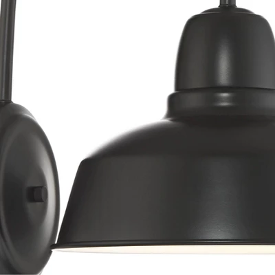 From the Urban Barn collection by John Timberland, this set of two indoor-outdoor wall lights will add rustic charm to your living space. This fixture features a long, thin curving gooseneck with a wide downlight shade attached to the end. An elegant black finish makes it a classic color accent that enhances a contemporary or transitional setting. Inspired by industrial workplace and barn lighting designs.